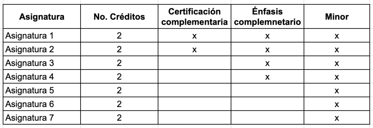 Tabla de asignaturas